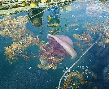 最近、エチゼンクラゲが大量に発生中で、今朝の漁のときも大変だった。300くらいいたのかな?。起こしてたら重くて途中で起せなくなっちゃうし、タモで船の上にすくって上げるには量が多すぎるので、諦めて浮き子の一部を沈めてそのまま出したくらい。魚も大量に逃がしてしまう事になるので、ホントはやりたくないんだけど、どっちにしろクラゲの毒で魚がやられてダメになっちゃうので、どっちもどっち。